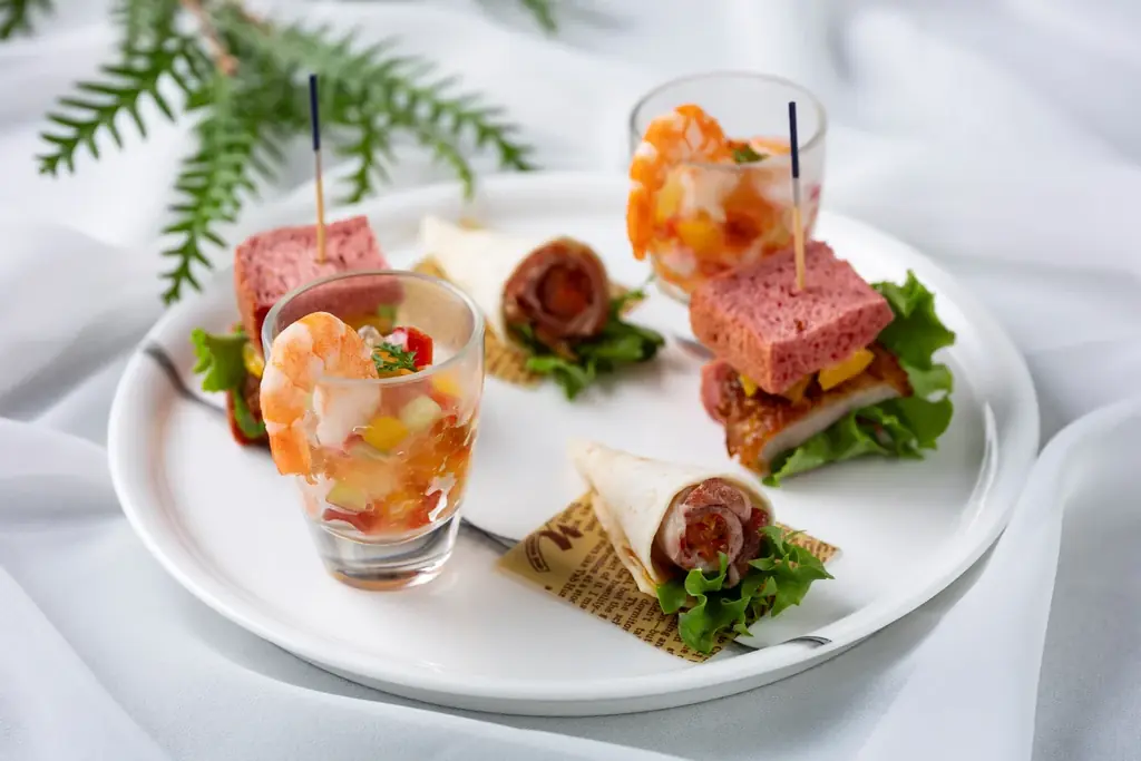 - 海老と梅のカクテルジュレ — 海老と季節の野菜をコンソメジュレでまとめ、梅の風味をアクセントに。