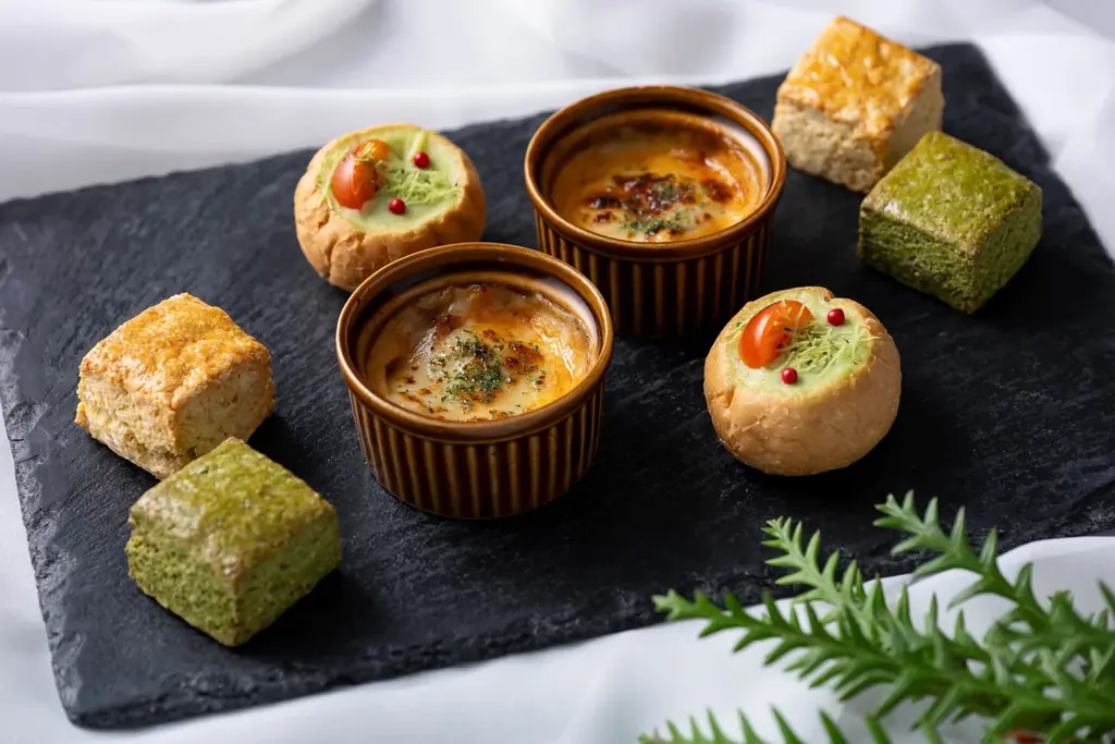 - グリーンピースとカダイフのブレッドカップ — ベシャメルとグリーンピースを詰め、カダイフで食感を付加。