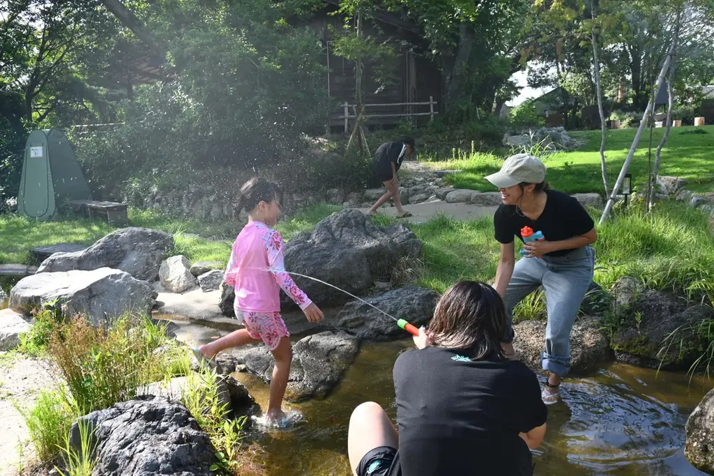 ウッドデザインパーク瀬戸は、ジブリパークからもアクセスが良い立地にあり、GWのレジャー拠点として利便性の高いロケーションに位置しています。敷地内には趣のある合掌造りの建物や新緑と水のせせらぎが調和した風景が広がっており、屋外でのリフレッシュに適した環境です。