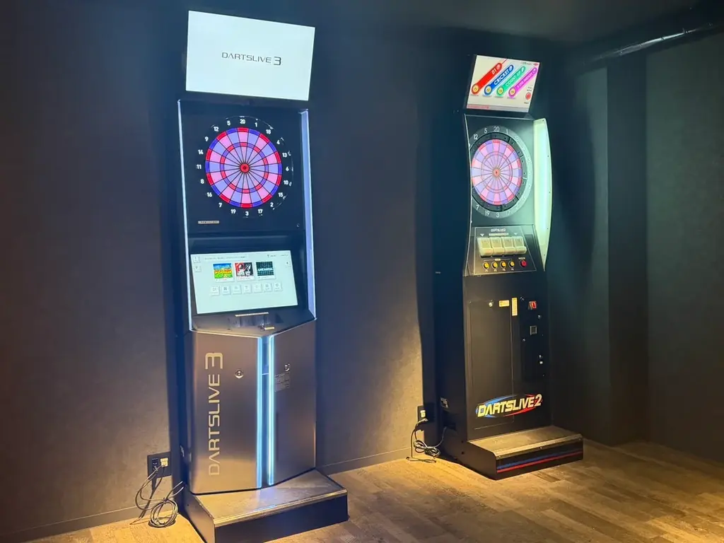 ダーツは合計5台を設置しています。内訳は「ダーツライブ2」4台と、オンライン対戦に対応した「ダーツライブ3」1台です。ダーツライブ3はオンライン対戦機能を有しており、外部プレイヤーとの通信対戦が可能です。
