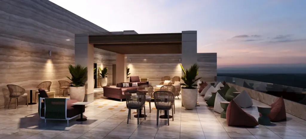 ルーフトップは夕暮れ時のサンセットビューを楽しむだけでなく、朝・昼・夜それぞれに異なる表情を見せるため、多様な時間帯での利用が想定されます。写真撮影やリラックスタイムにも適した空間です。