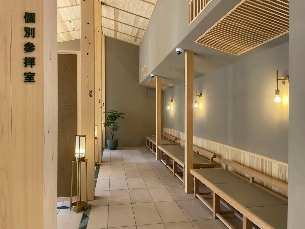 施設内には草花木をコンセプトにした6つの参拝スペースが用意されています。これにより、参拝の目的や人数に応じた選択が可能で、個別の祈りの時間を確保できる設計になっています。個別参拝室はプライベートな空間として利用でき、必要に応じて窓を開けて中庭と一体化させることができます。