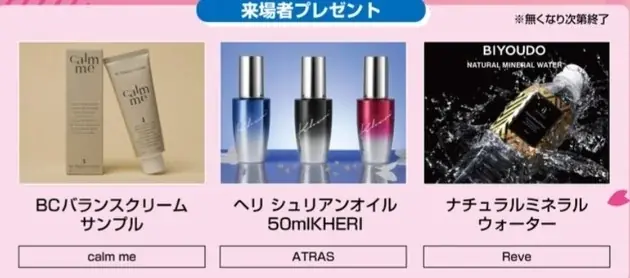 | 来場者特典 | 受付での配布(calm me BCバランスクリーム、ヘアオイル、ミネラルウォーター等/数量限定)、本部ガチャで豪華グッズが当たる |