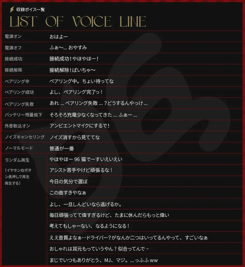 本製品限定の仕様として、起動・終了や接続状況を知らせるボイスガイダンスが96猫仕様で収録されています。さらに、コラボモデル限定のランダムボイスも搭載され、ユーザーは本製品でしか聴けない音声を体験できます。