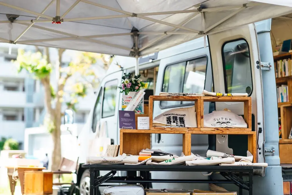書籍ブースは新刊・古書を取り扱う店が出店し、日用品の販売を組み合わせる店舗もあります。散歩の途中に本と出会う場としての機能が期待されます。