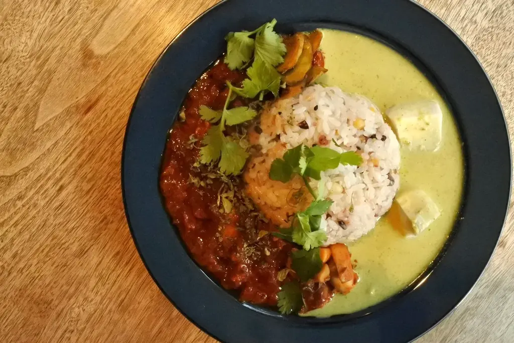 - Q-CHANG CURRY:スパイスとハーブを挽いて作る手づくりのオリジナルグリーンカレー(化学調味料不使用)。