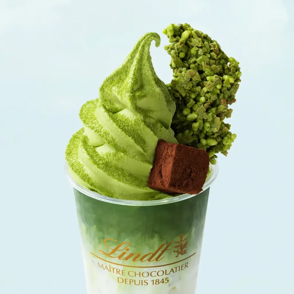 - トッピング:抹茶チョコレートでコーティングしたライスパフ、リンツオリジナルのチョコレートわらび餅を添えてサクサクとした食感とやわらかな口どけの対比を付与。