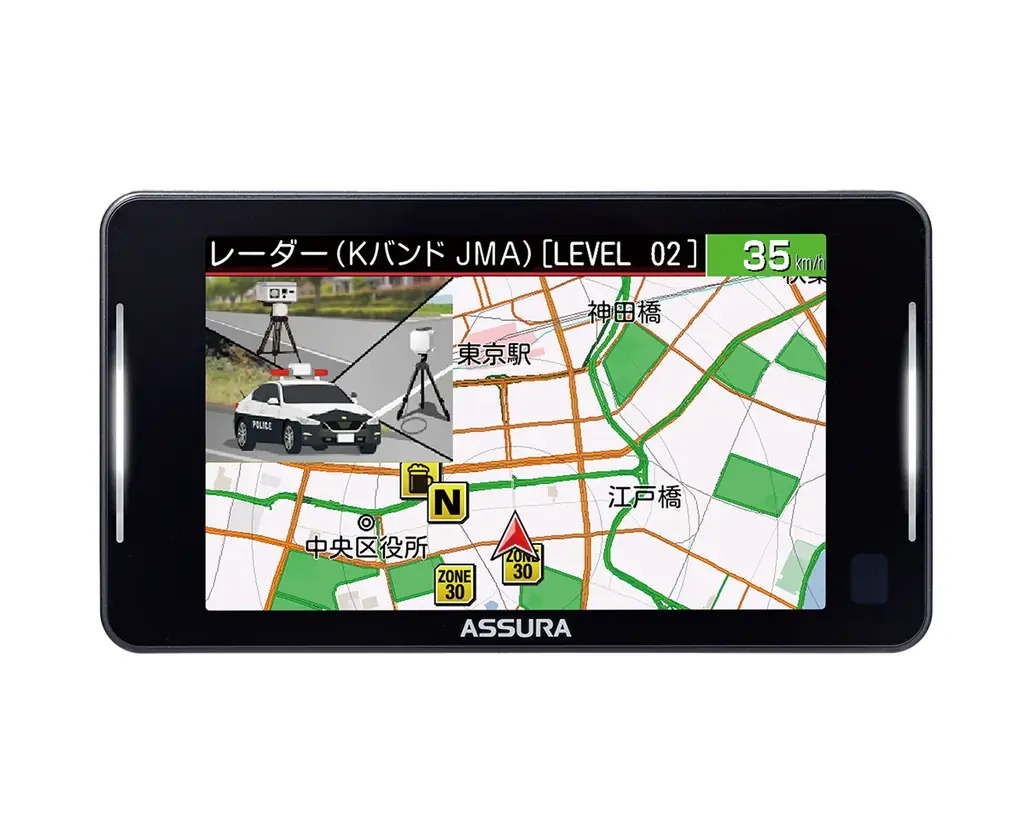 地図表示はゼンリンのフルマップを搭載しており、市街地図やゾーン30のエリア表示、コンパスナビ機能が利用可能です。地図に沿って警告や案内の表示が行われ、ドライバーの視認性に配慮しています。
