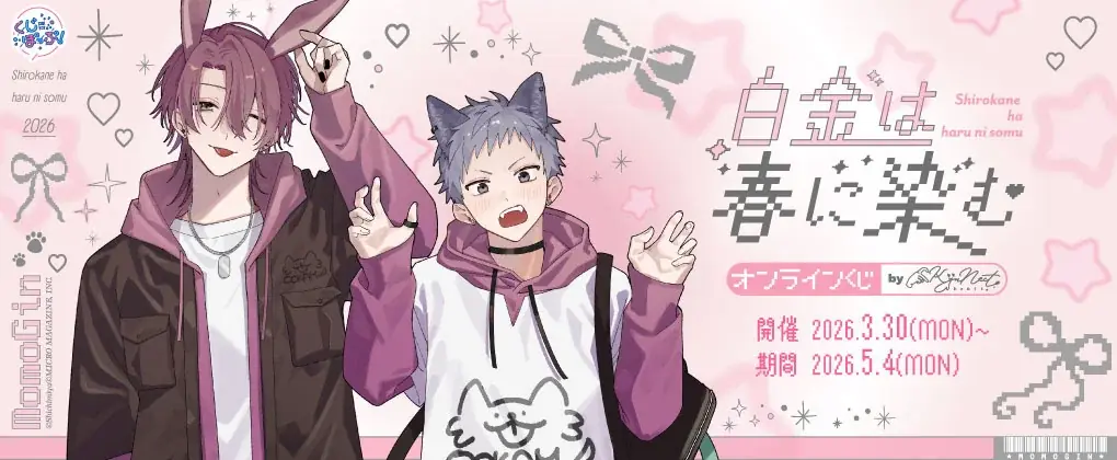 配信開始と同じくして、オンラインくじサービス「くじぽっぷ!」に『白金は春に染む』が期間限定で登場します。くじではしちみや先生による新規描き下ろしのアニマルコーディネートイラストを使用したグッズがラインナップされています。