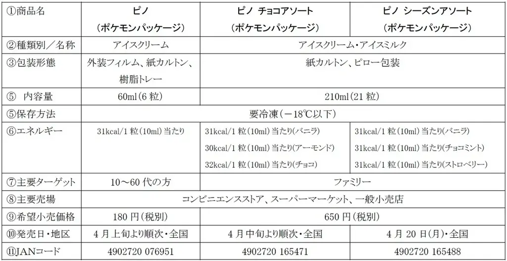 | 発売時期 | ピノ(ポケモンパッケージ):4月上旬より順次/ピノ チョコアソート:4月中旬より順次/ピノ シーズンアソート:4月20日(月)より |