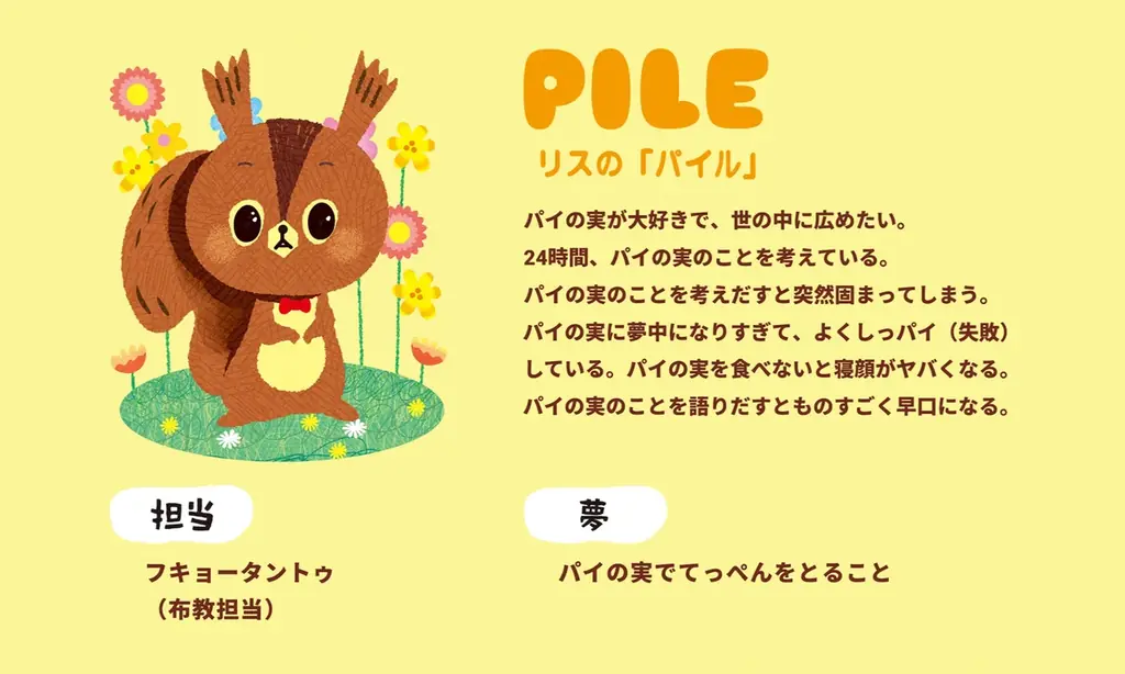 - パイル(リス):フキョータントゥ。パイの実でてっぺんを目指す熱血リス。語りが早口になりがちで24時間パイの実を考える布教担当。