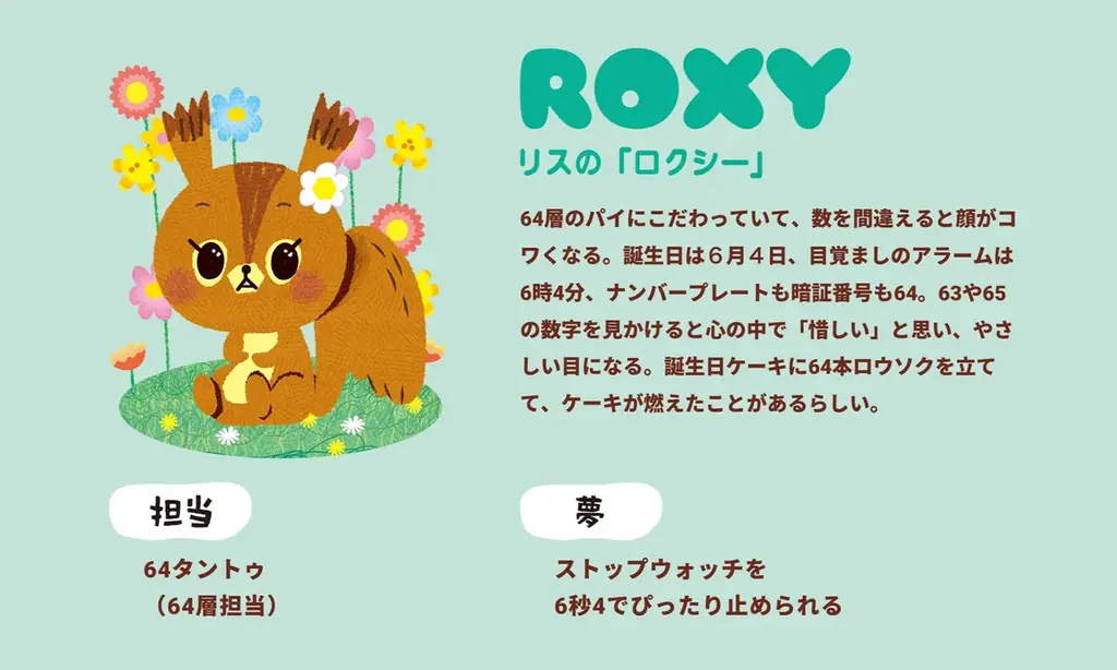- ロクシー(リス):64タントゥ。パイの「64層」の断面をこよなく愛するビジュアル担当。層を一つでも間違えられると表情が変わるほどのこだわりを持つ。