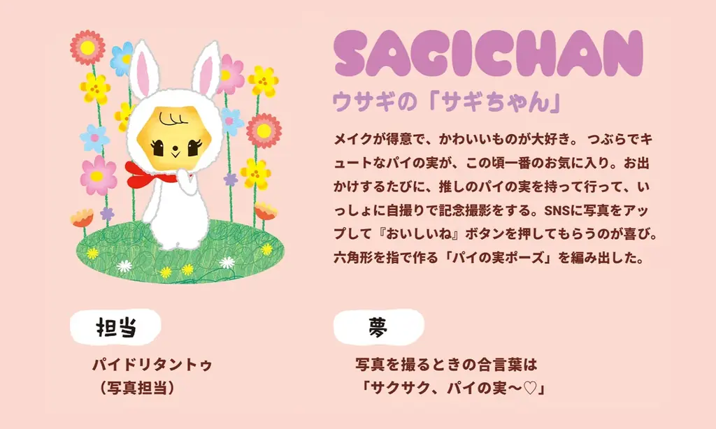 - サギちゃん(ウサギ):パイドリタントゥ。SNS映えを追求し「パイの実ポーズ」を考案する写真担当。合言葉は「サクサク、パイの実~♡」。