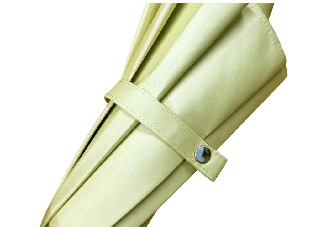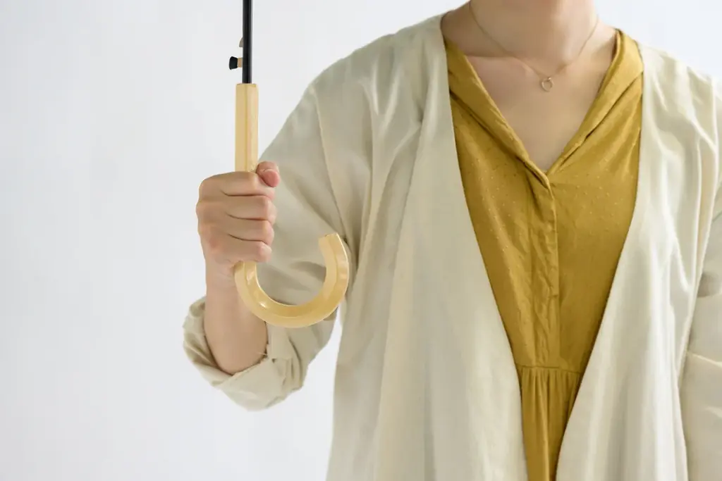 生地は三層構造を採用し、熱や光を遮断する機能を確保しています。さらに本製品は木製の手元を採用し、持ち心地にぬくもりを与える設計としました。ホックタイプの留めベルトや表面のパイピング加工など、使い続けたくなる細部の工夫も盛り込まれています。