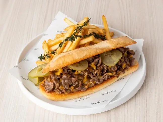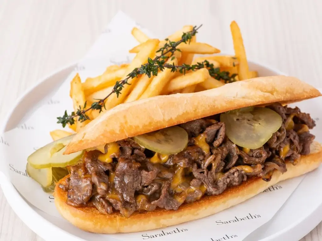 これらのフィリングを、外はカリッと中はふんわりのソフトバゲットにサンドし、仕上げにフレンチフライを添えた構成です。味の要点は、牛肉の旨み、チェダーのコク、オニオンの甘み、ピクルスの酸味がバランス良く調和したところにあります。