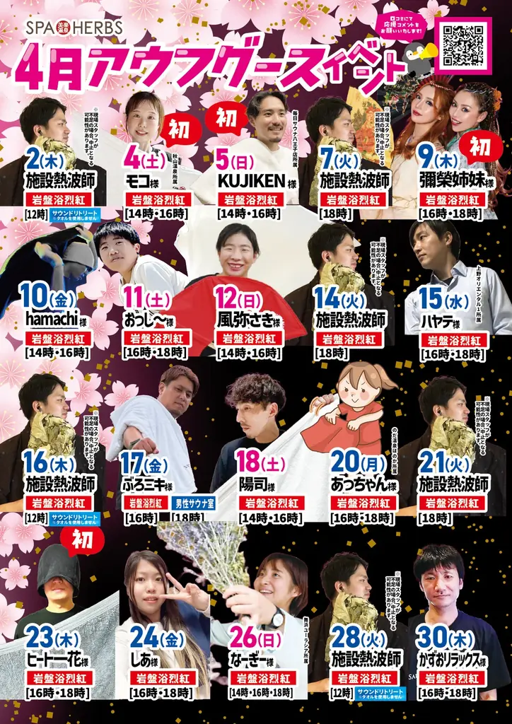 | アウフグース | 場所:岩盤浴「烈紅」/参加条件:岩盤浴プラン利用者のみ(中学生未満は不可)/整理券制(フロント配布)/一部回は男性サウナ室で実施/内容は変更の可能性あり |