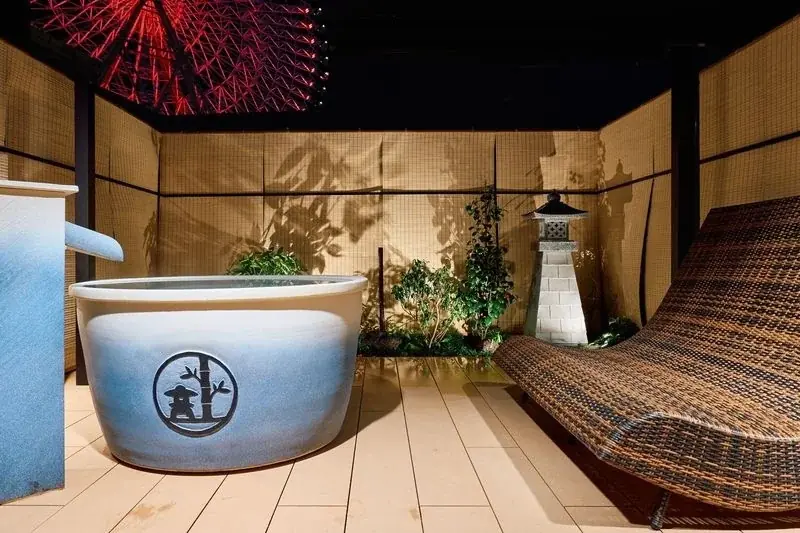 「今昔荘 大阪 天保山 – 高灯籠 -」は“古き良き日本”と“現代的な快適さ”を融合したデザインを特徴とし、特に光と陰影の演出により非日常感を創出する「高灯籠」というコンセプトが施設の核になっています。屋上風呂に置かれた高灯籠がビジュアルと体験の象徴となり、窓からは大観覧車の景色を望めます。