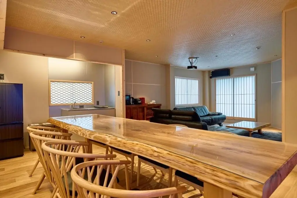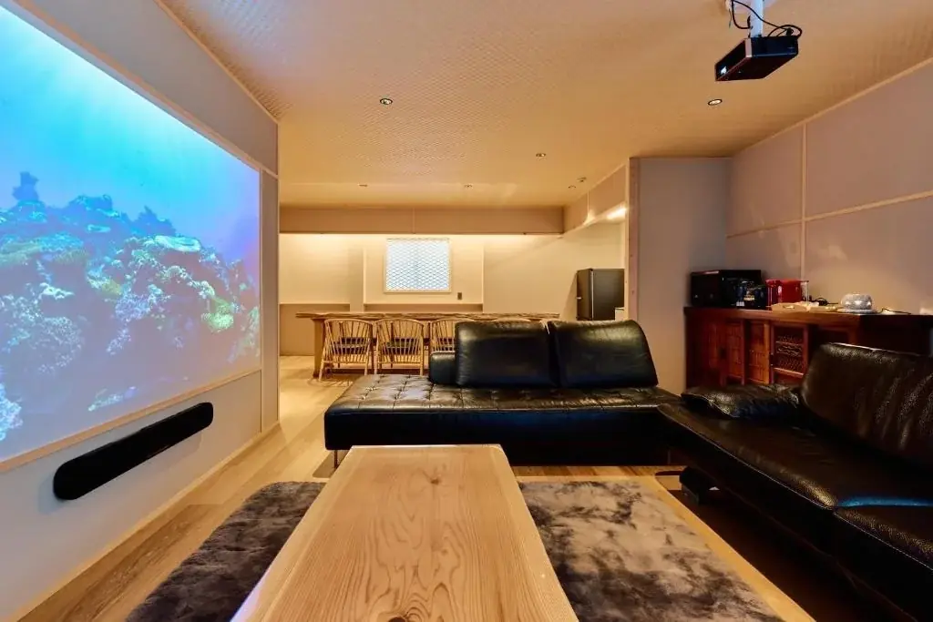 テラスや窓越しに望む夜のイルミネーションやベイエリアの風景、海遊館などの観光施設へのアクセスなど、立地の魅力を体験価値に結び付ける設計がなされ、最大15名までのグループやファミリー利用に対応できる収容力を有しています。リビングにはプロジェクターと大型テレビ、さらにNintendo Switchを完備しており、滞在中の娯楽設備も充実しています。