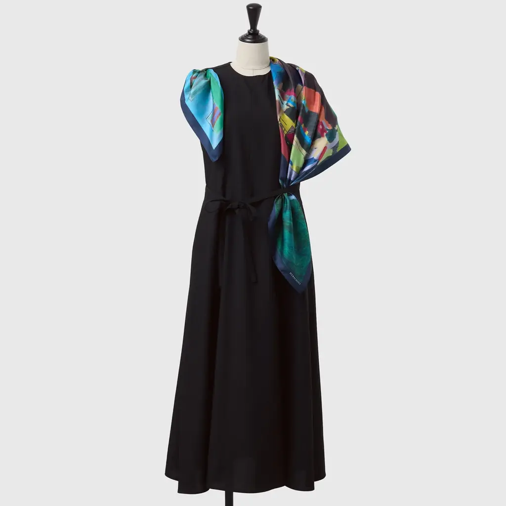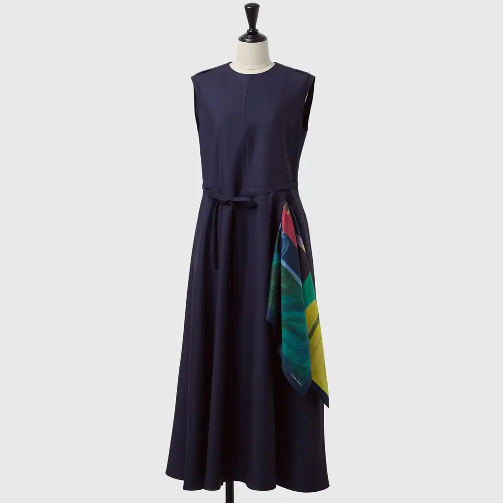 スカーフコンビレザーショルダーは本革を用い、スリットにスカーフを通して使う仕様です。スカーフアタッチメントワンピースは肩やウエストのループにスカーフを通すことで多様な表情のスタイリングが可能です。