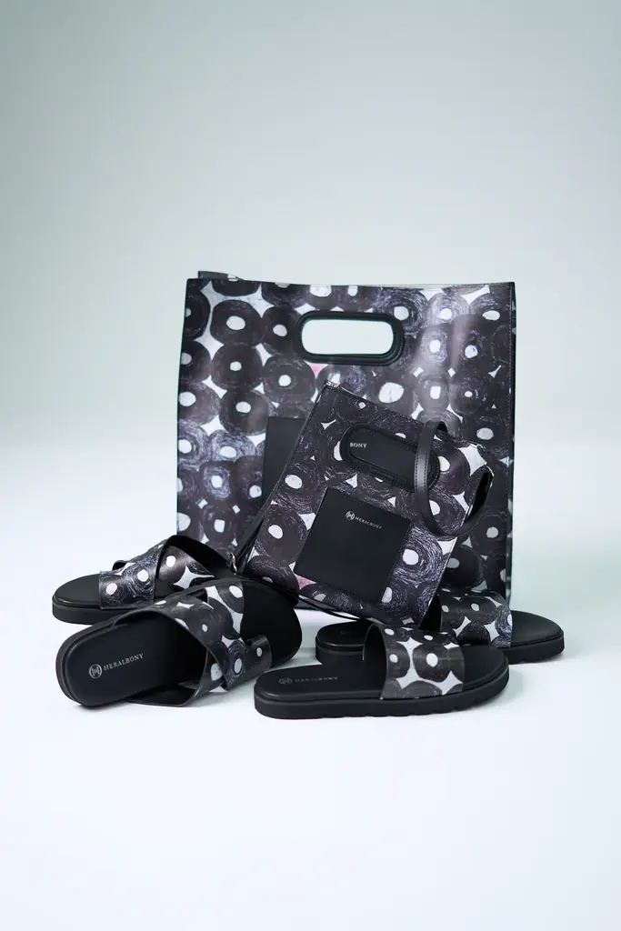 リサイクルレザーは軽さとプリントの美しさを特長としており、日常使いから仕事用まで幅広く活用できる仕様です。サンダルは選べる3サイズを展開し、バッグは2サイズを用意している点もポイントです。