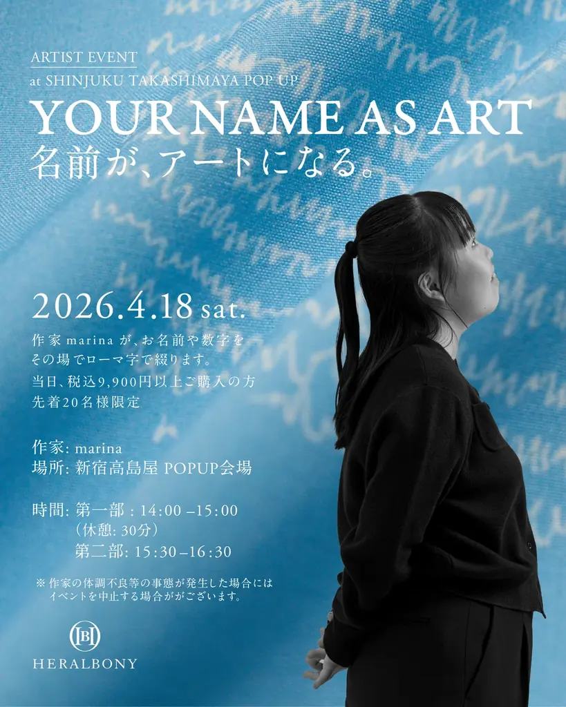 イベント「YOUR NAME AS ART―名前が、アートになる。」は、4月18日(土)に新宿高島屋2階ザ・メインスクエアのポップアップ会場で開催されます。作家・marina氏がその場でお客様の名前や数字をローマ字で描き下ろす形式のイベントです。