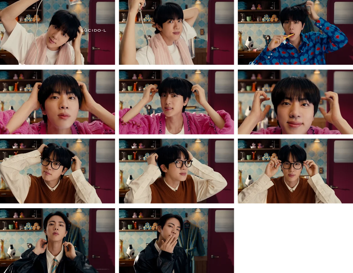 新CMは、日常の身支度やスタイリングの瞬間を切り取り、Jinさんの多面的な表現力でシリーズの「選べる仕上がり」をポップに描写しています。お風呂上がりのドライヤーシーンから始まり、パジャマ姿、ピンクのカーディガンでオイルを馴染ませるシーン、眼鏡で知性的な表情を見せる場面、最後にライダースジャケットとネクタイで締めるシーンへと移行します。
