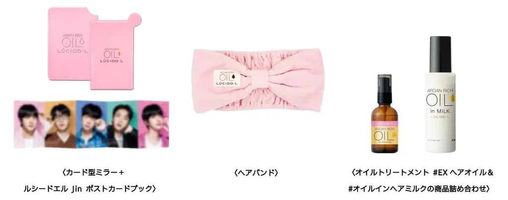 | 賞品(当選者数) | A賞: カード型ミラー+Jinポストカードブック(500名) B賞: ヘアバンド(500名) C賞: オイルトリートメント詰め合わせ(100名) |