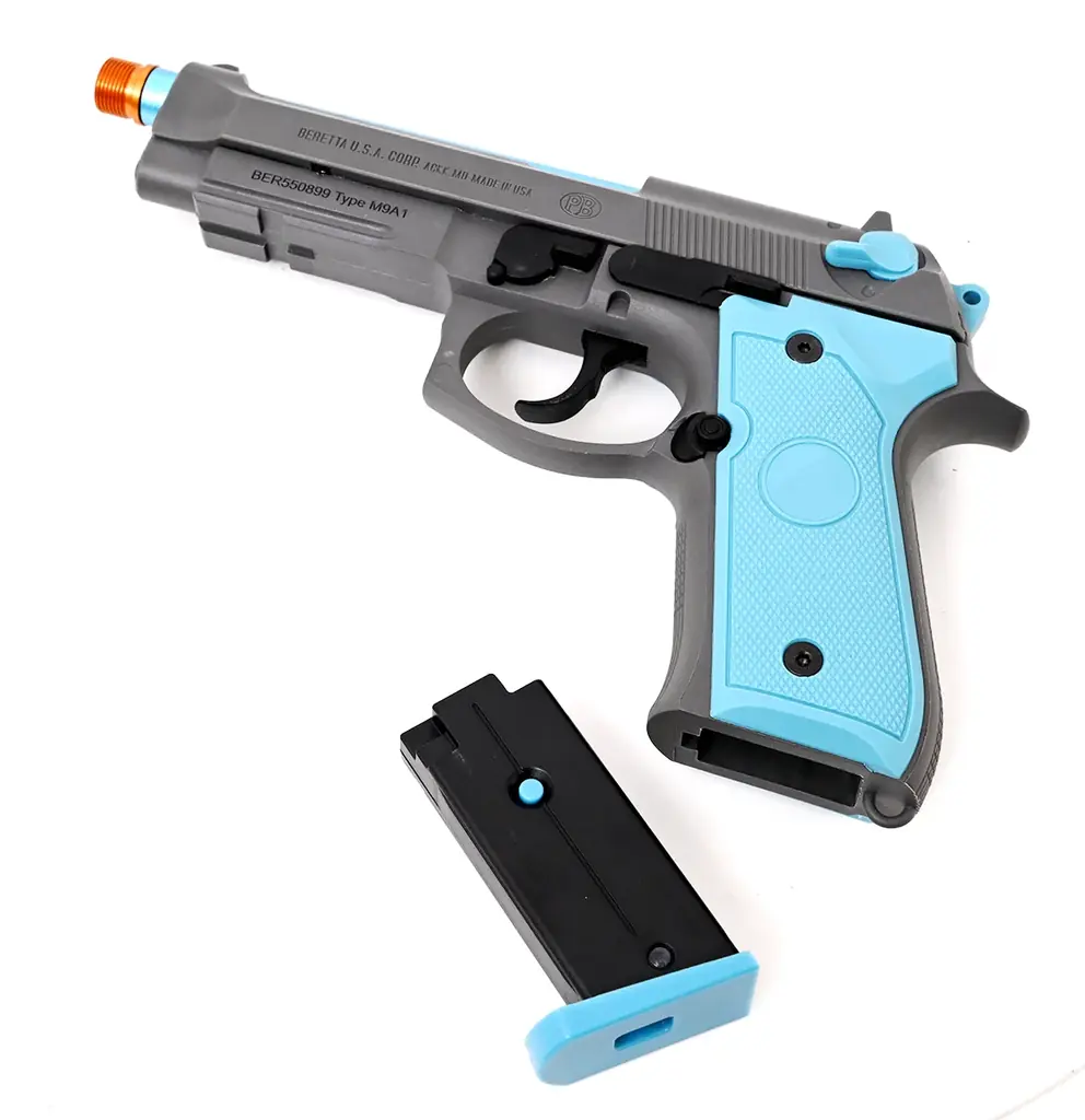 - マガジン装弾数は15発。バネを利用した手動ブローバック方式を採用しており、発射時にブローバック感が手に伝わる構造です。リロード操作を行うことで再装填され、発射可能になります。