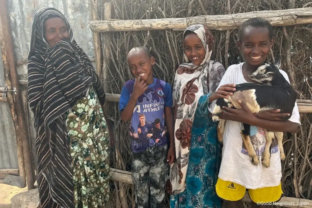 海外では、子どもたちへの教育支援や生計向上支援、紛争や災害などから逃れてきた難民への緊急支援を行っています。家畜支援を通じて子ヤギが誕生し、難民の家族に笑顔が戻るといった事例も報告されています(エチオピア ソマリ州、2025年9月撮影の事例)。