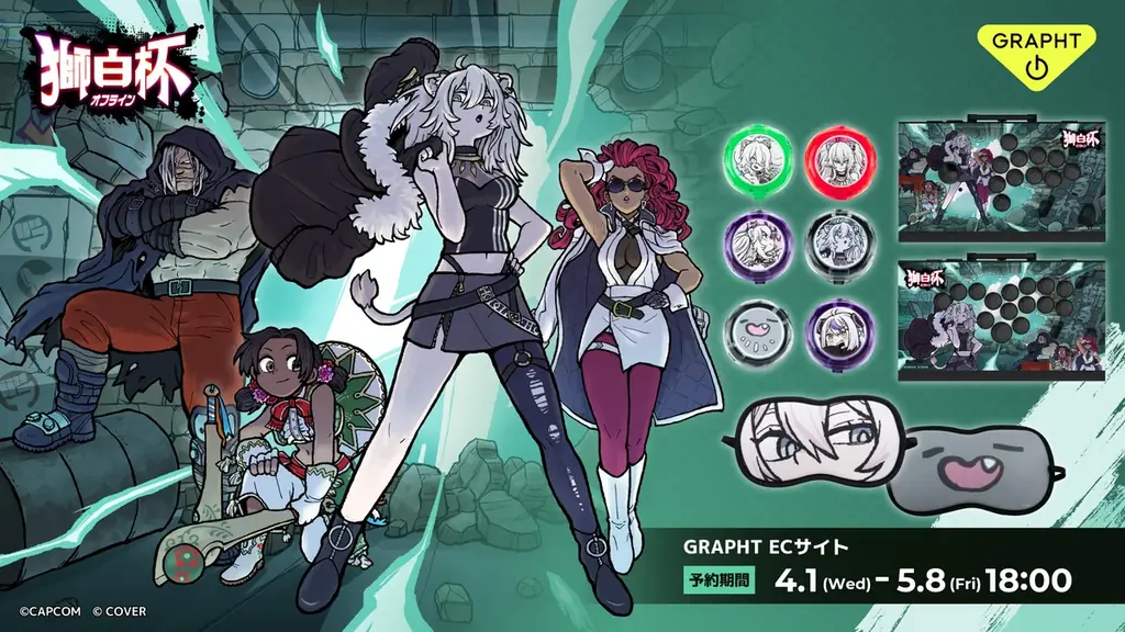 協賛の具体的な形としては、GRAPHTのカスタムアーケードコントローラーシリーズGRAPHT REMIXERS iOの上パネルを獅白杯キービジュアルで彩った『iO 獅白杯 – オフライン – Edition』の提供、三和電子製の24φアケコン用交換ボタンを採用した2WAY仕様のコラボボタン全6種、さらに獅白ぼたんとSSRBを配したリバーシブルアイマスクの展開など、アーケードコントローラーを中心とした物販構成でイベントに参加します。