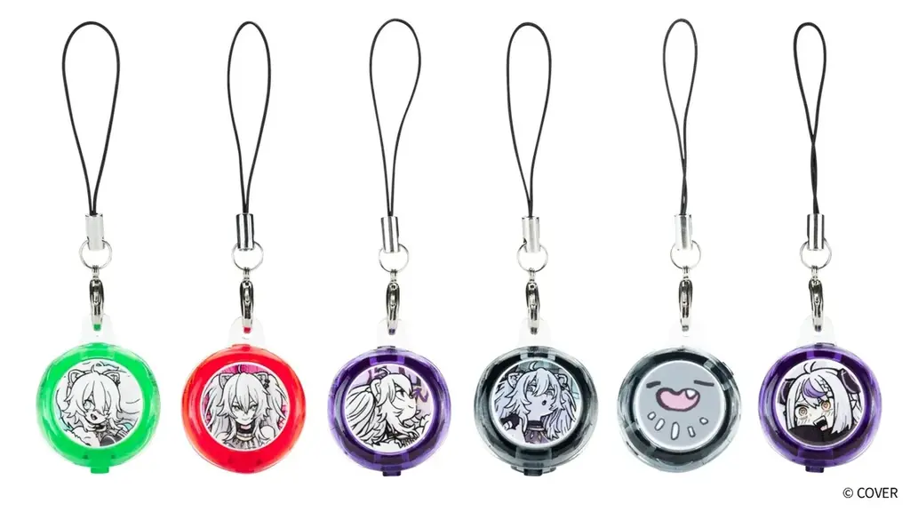 三和電子製の24φサイズの交換ボタンをベースに、歴代『獅白杯』のキービジュアルをあしらった4種類、さらにラプラス・ダークネスとSSRBをデザインした2種類を加えた全6種が用意されています。ボタン自体は『iO』に取り付け可能で、付属のストラップ部を用いて日常帯のアクセサリとしても利用できる2WAY仕様です。