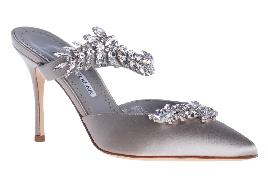 - 特徴:大粒のクリスタルが光を受けてきらめく、春夏シーズンにおすすめのミュール。