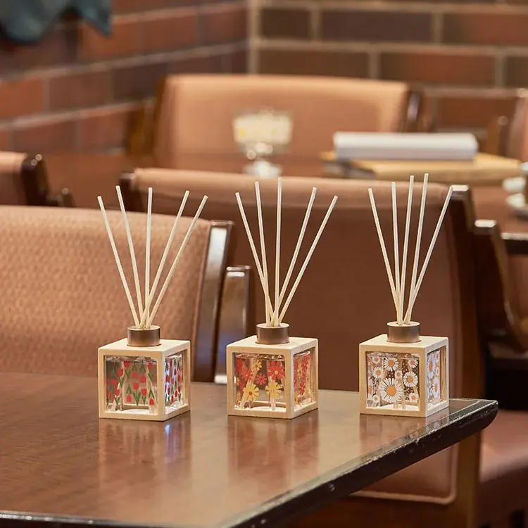 香りは花モチーフに季節感を加えた仕上がりで、ボトルを引き立てるウッドフレームはナチュラルなインテリアアクセントになります。使い切った後のボトルは一輪挿しとして再利用することも可能です。