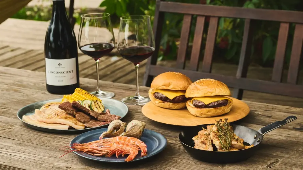 - ヴィンヤードBBQ(写真は2人前): 余市町ブランド豚「北島豚」肩ロース、EBIJINの鹿肉バーガー、チキンステーキwith香味ソース、牛ロース、季節の焼き野菜