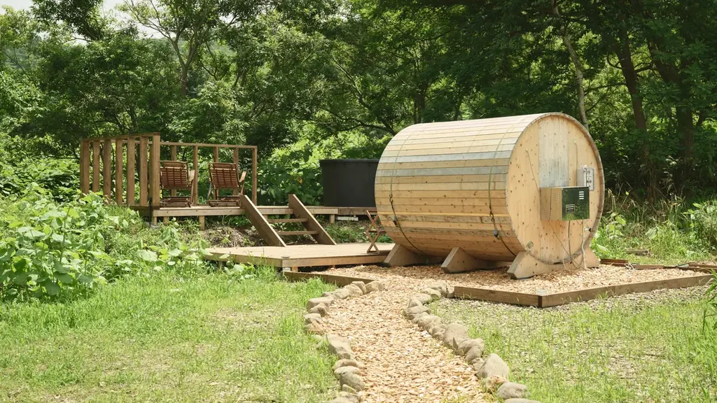 サウナはバレルサウナ形式で貸切利用が可能です。セルフでロウリュを行うことができ、川に面したウッドデッキで水風呂と外気浴を楽しめます。2026年度は写真と異なるサウナへリニューアル予定であり、利用環境の向上が図られます。