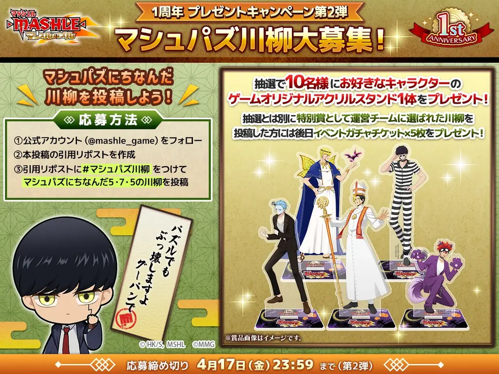 | 公式X プレゼントキャンペーン第2弾(川柳) | 2026/4/4〜4/17 23:59 | 5・7・5形式の川柳を投稿して応募。運営選定の特別賞あり | アクリルスタンド(抽選10名)、特別賞でガチャチケット×5 |