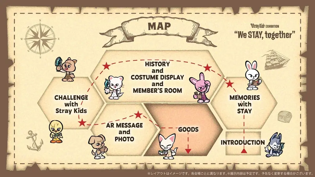 本展覧会は「宝探し」をテーマに、Stray Kidsの日本での活動や世界的な躍進をビジュアルと体験で振り返る構成になっており、ファンである「STAY」とメンバーとの絆を感じられる内容が用意されています。全日日時指定制で運営され、入場は閉場1時間前までとなります。最終日は18時閉場となる点に注意が必要です。