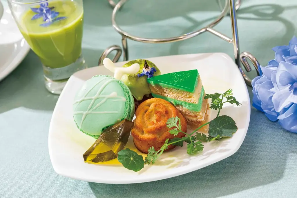 セイボリーは緑色の食材やハーブを活かした軽やかな料理で構成され、スイーツの合間に心地よい口直しを提供します。セイボリーはアフタヌーンティーにのみ提供され、スイーツのみを楽しむ場合はデザートスタンドの選択が可能です。