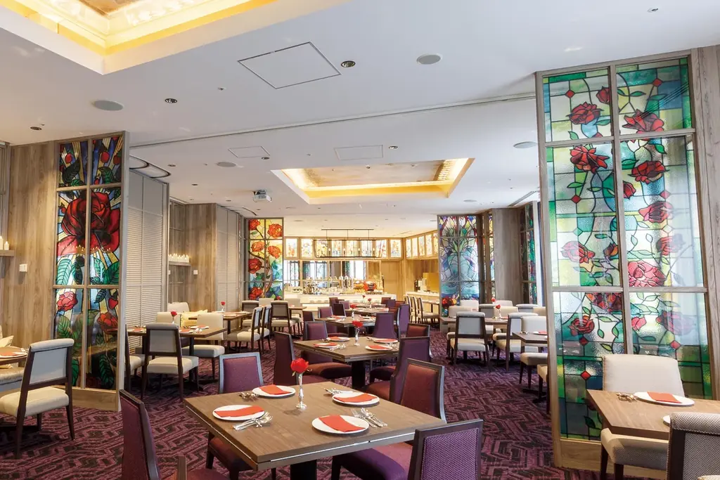 会場となる『ファンタジーダイニング フルール』は、お城のメインダイニングをイメージした優雅で幻想的な空間です。ローズをモチーフにしたステンドグラス風の装飾、キャンドルの温かな照明が特徴で、ドラマティックな雰囲気の中でティータイムが楽しめます。