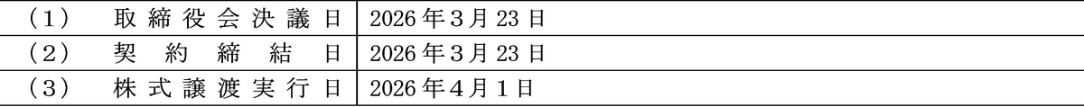 - 取締役会決議日(2026年3月23日)と発表日(2026年4月1日)および実行の記載はありますが、その他のスケジュール(クロージングの日付等)の詳細は発表資料での確認を促しています。