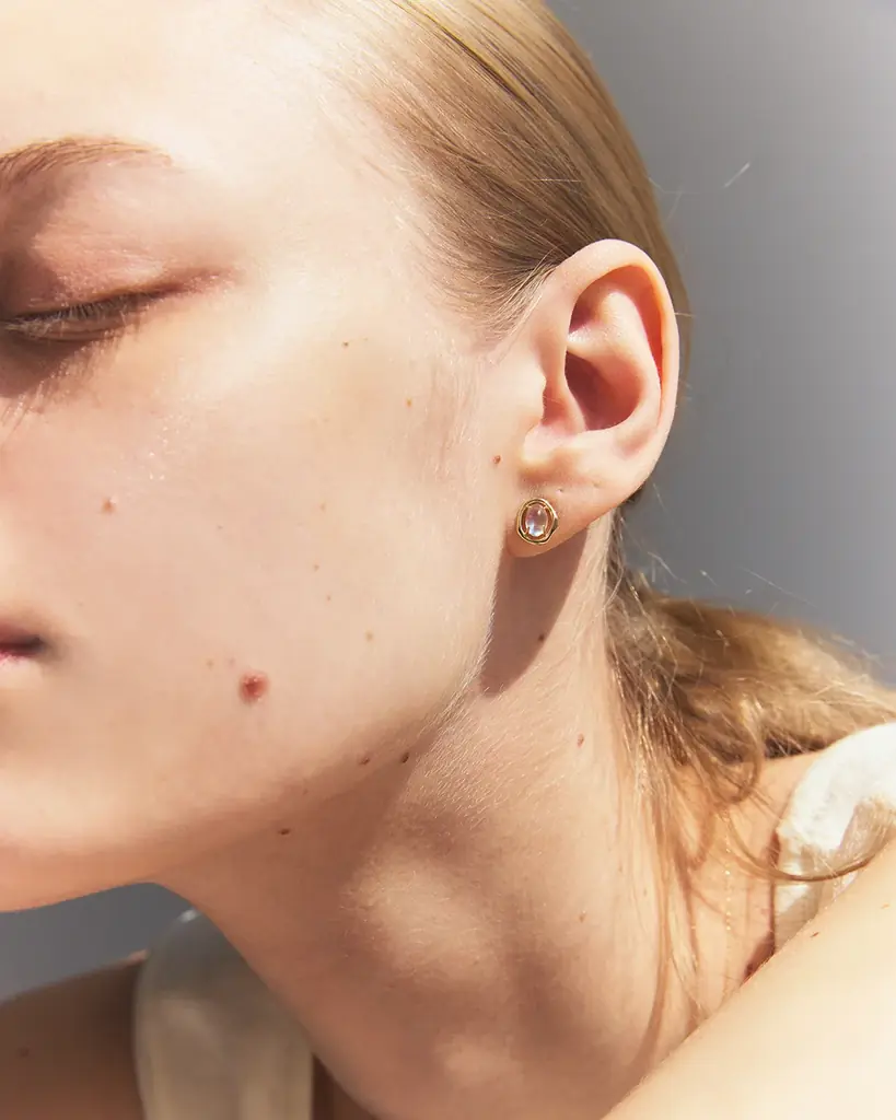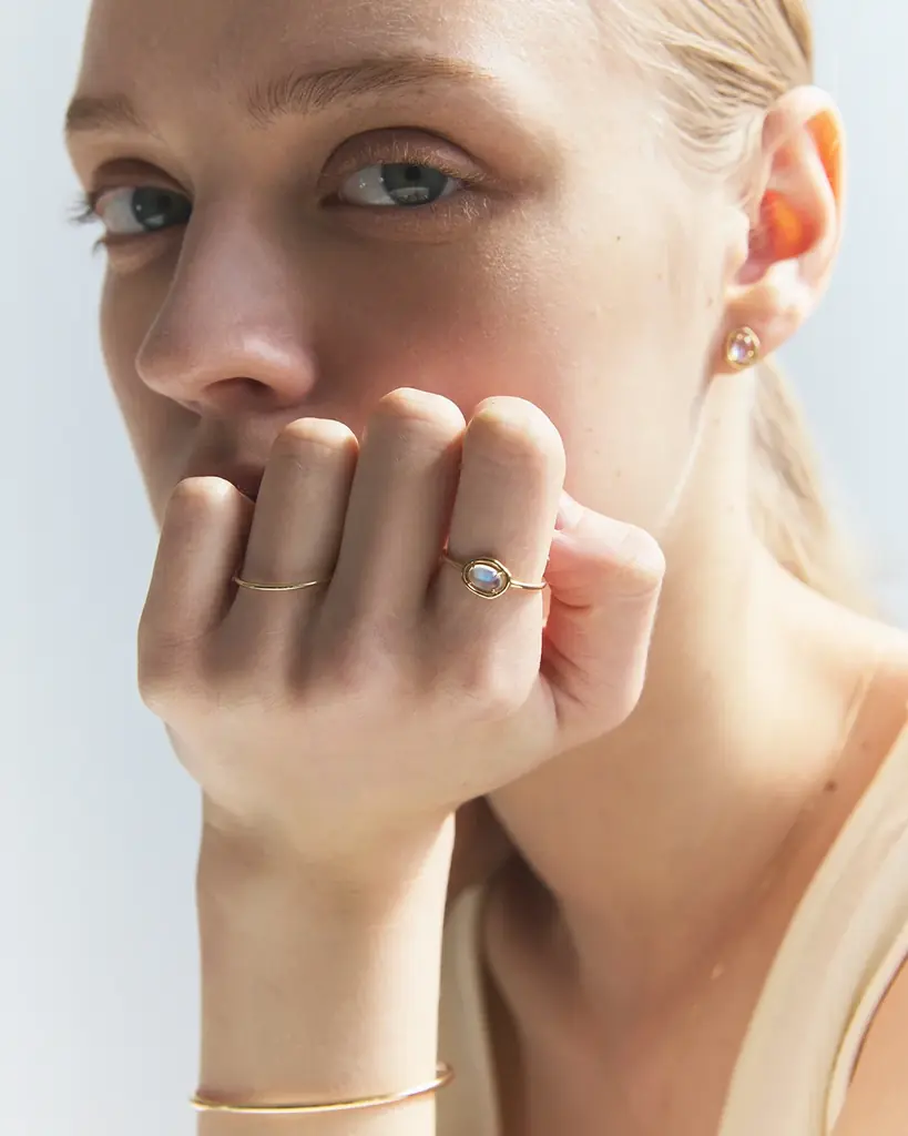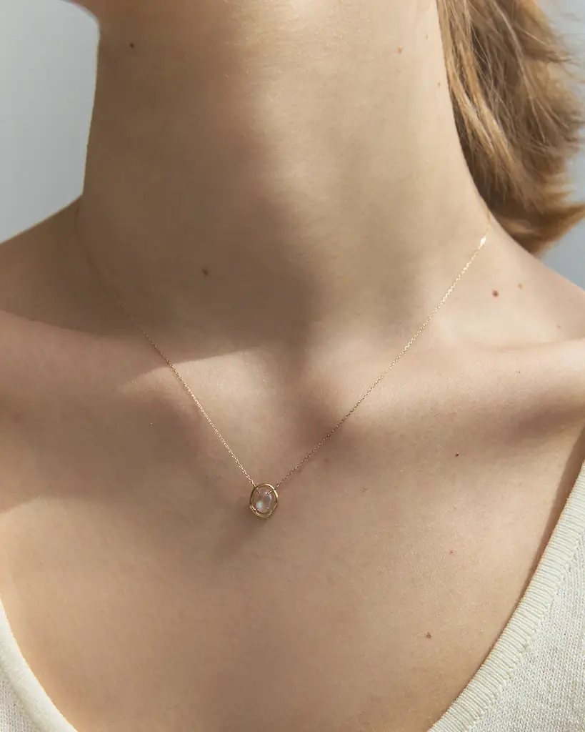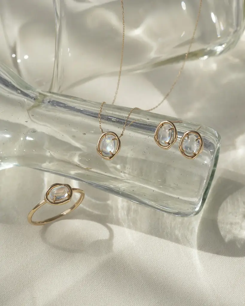 光が透過する瞬間の透明感を形にしたシリーズです。独特の虹色のシラーを見せるレインボームーンストーンを主役に据え、光が肌に溶け込むような繊細な枠で仕立てられています。着用時に表情を明るく見せるデザインが特徴です。