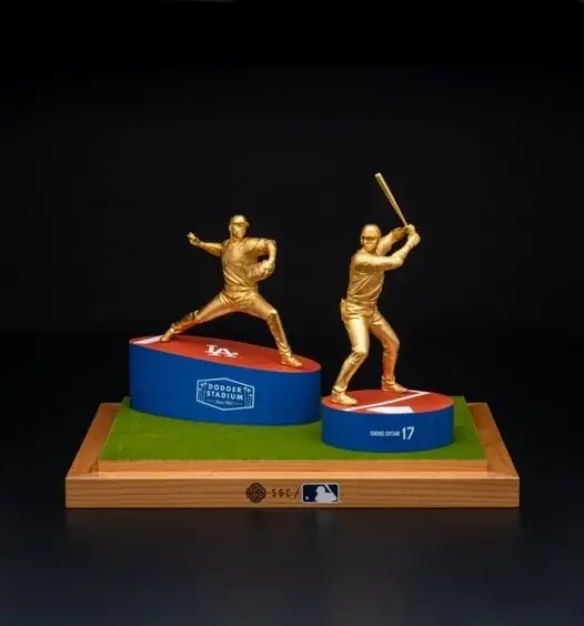 | 像の主な仕様 | バッター:金箔1,550枚、高さ約1.9m(台座からバット先端約2.4m)、参考価格 税抜5,000万円(税込5,500万円) ピッチャー:金箔1,450枚、高さ約1.7m、参考価格 税抜5,000万円(税込5,500万円) 二体合計 税抜1億円(税込1億1,000万円) |