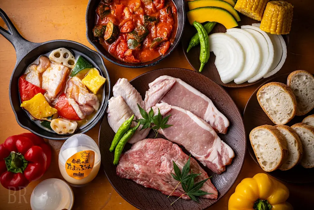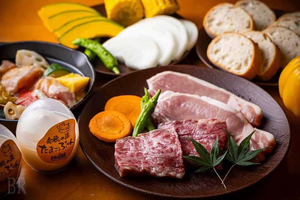 食事はスタンダードBBQとプレミアムBBQの2コースを基本に、姫路和牛などの兵庫のブランド牛や国産黒毛和牛を中心とした肉類、さらに赤穂周辺で調達される新鮮な海鮮オプションを豊富に取り揃えています。開放的な屋外空間で地元の食材を楽しめることが特徴です。