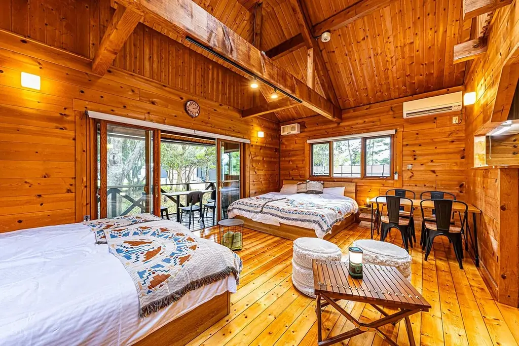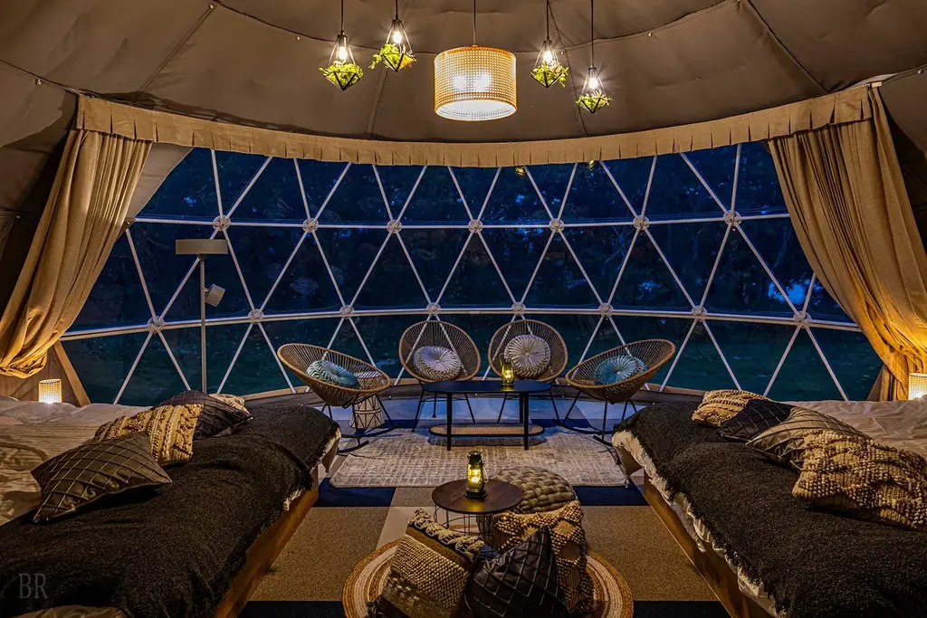 客室はコテージ、ドッグヴィラ、ドームテントの3タイプを用意。全室冷暖房完備で、滞在中は冷蔵庫内のドリンク(アルコール・ソフトドリンク)を無料で提供するサービスが付帯しています。これは小さな子ども連れやグランピング初心者にも配慮した設計です。