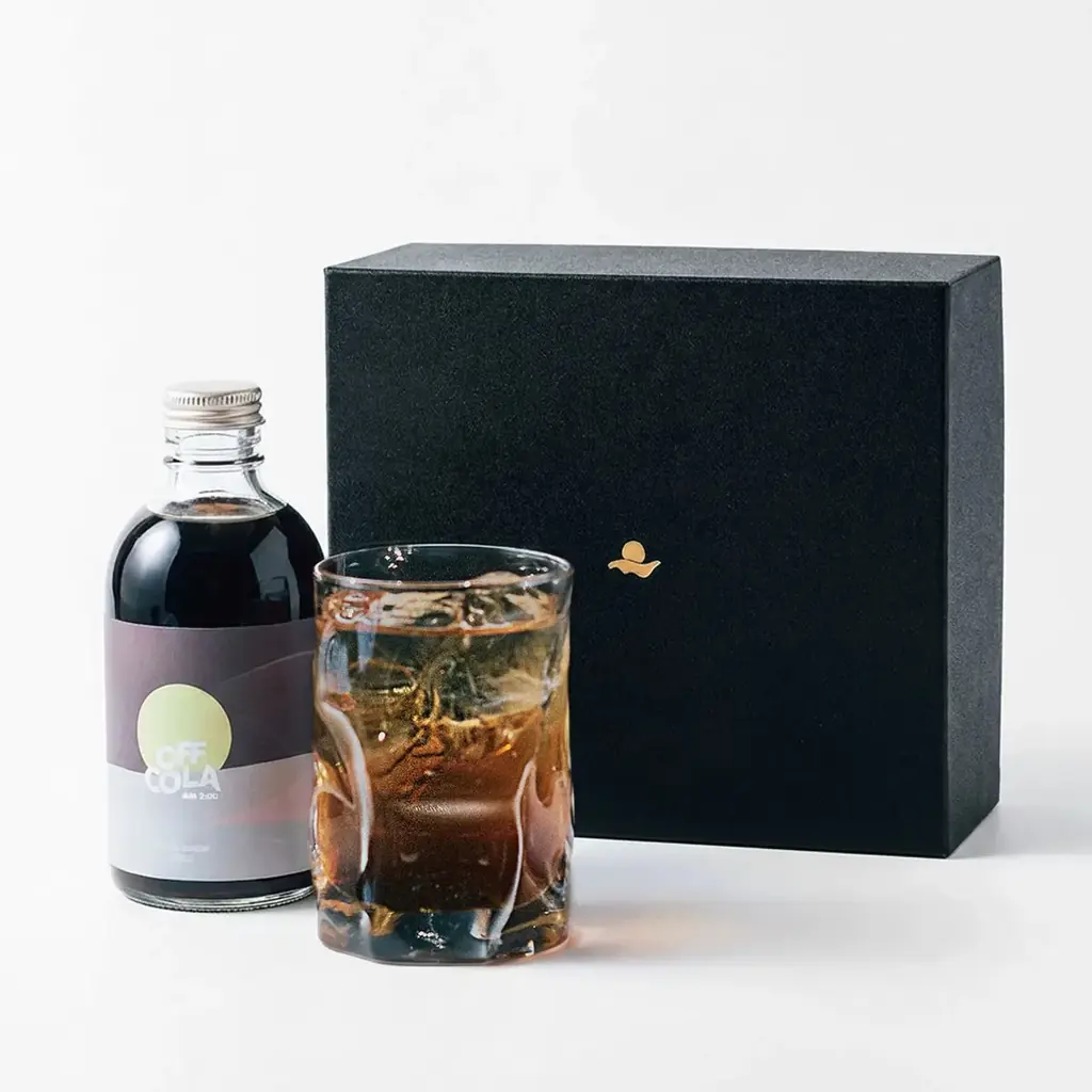 特製グラスは透き通るガラスにゆらぎを持たせたフォルムで、OFF COLAの世界観を器として体現した一客となっています。深夜の静かな時間を楽しむための「飲む体験」を贈るセットです。