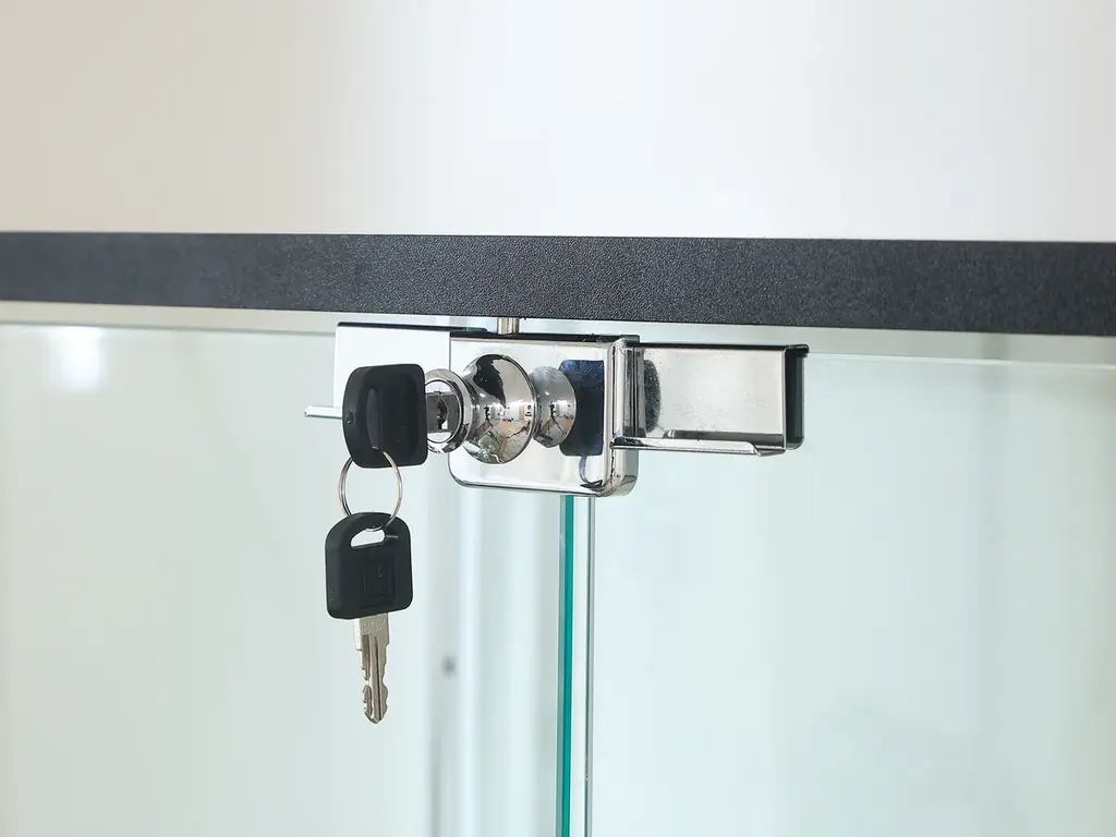 扉下部のマグネットは、扉の閉鎖状態を安定させるための構造であり、展示物に対する衝撃や振動時のぐらつきを抑える役割を持ちます。鍵付き仕様は保管性の向上を図るための実用的な追加機能です。