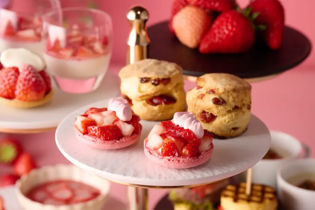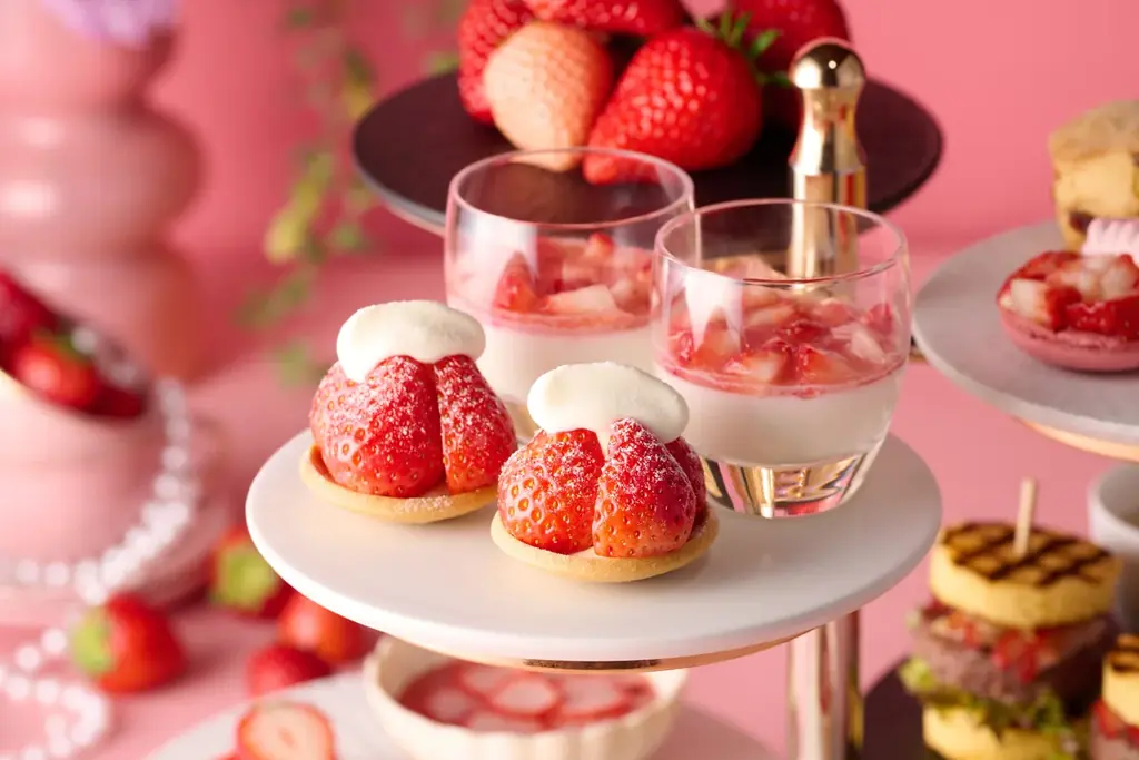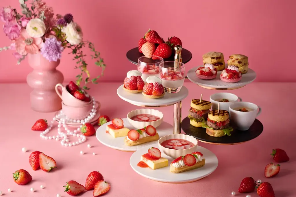 6段のスタンドに並ぶのは、7種のスイーツと2種のセイボリー。それぞれに厳選した国産いちごを用い、素材の特性を活かした構成です。ドリンクは紅茶やコーヒーに加え、自家製フルーツビネガードリンクなど10種類以上が飲み放題で選べます。
