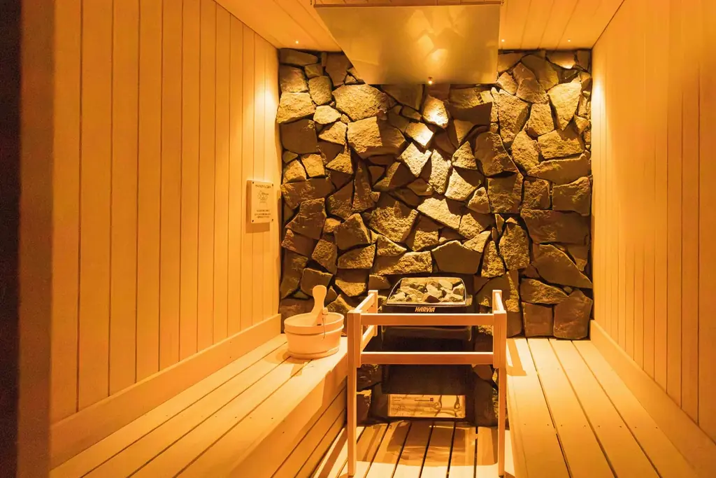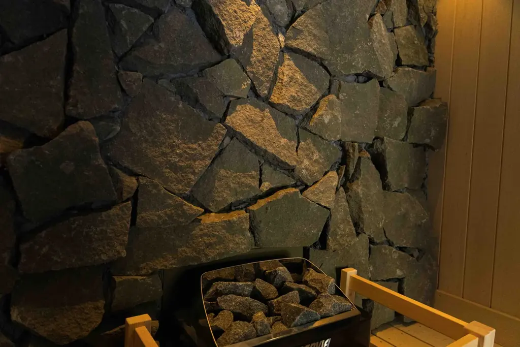 - 来待石の壁面、穏やかな温度設計、セルフロウリュ可。