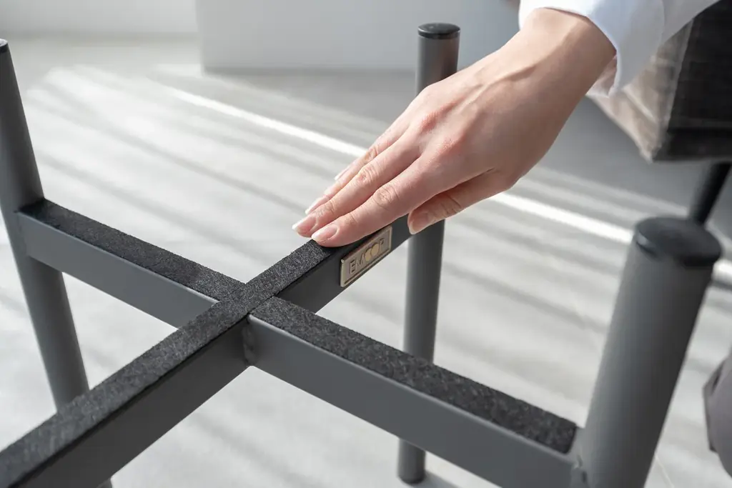 フレームはスチール製で、脚部にはキズ防止のフェルトおよびキャップを装着。特にスタッキング時やフローリング・畳での使用時に床面を保護する配慮がなされています。スタッキングの際にもフレーム裏面にフェルトが付いているため、重ねた際の傷つきを抑える設計です。