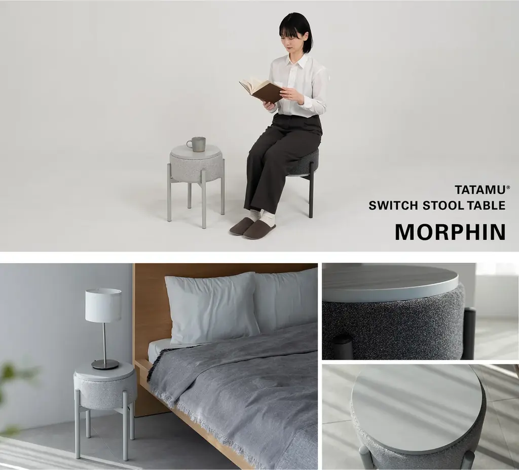 MORPHINは一台で「座る」「置く」「重ねる」という三つの役割を持たせた多機能家具です。表裏を切り替えることでクッションスツールからフラットな天板のサイドテーブルへと変形し、使わない時は複数台をスタッキングしてコンパクトに収納できます。デザインはTATAMU®シリーズの思想に基づき、空間有用性と安全性を重視した人間工学的アプローチによって設計されています。